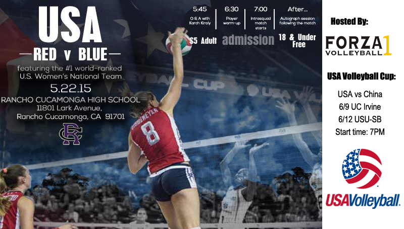 Come and see the #1 ranked USA Women’s volleyball national team in their RED vs BLUE scrimmage. The event takes place Friday, May 22nd at Rancho Cucamonga High School Gym Doors open @ 5:30pm $5 Adults 18 and under FREE. Come early! Invite your friends and family for food, fun and great volleyball! Hosted in conjunction with Rancho Cucamonga High Volleyball and a local club FORZA at Rancho Cucamonga high school gym.